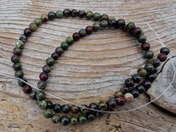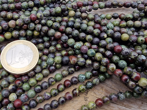 Natürlicher Epidot Jaspis - Drachenblut mit polierter Oberfläche. Die Steine sind als Kugel geschliffen, haben einen Durchmesser von ca.4mm und sind einzeln am Strang aufgefädelt. Die Kette hat noch keinen Verschluss. Der Strang ist ca.38cm lang. (Durch die Musterfotos kann es zu leichten farblichen Abweichungen kommen. Einschlüsse im Stein sind ein Zeichen der Natur). VPE = 1 Strang