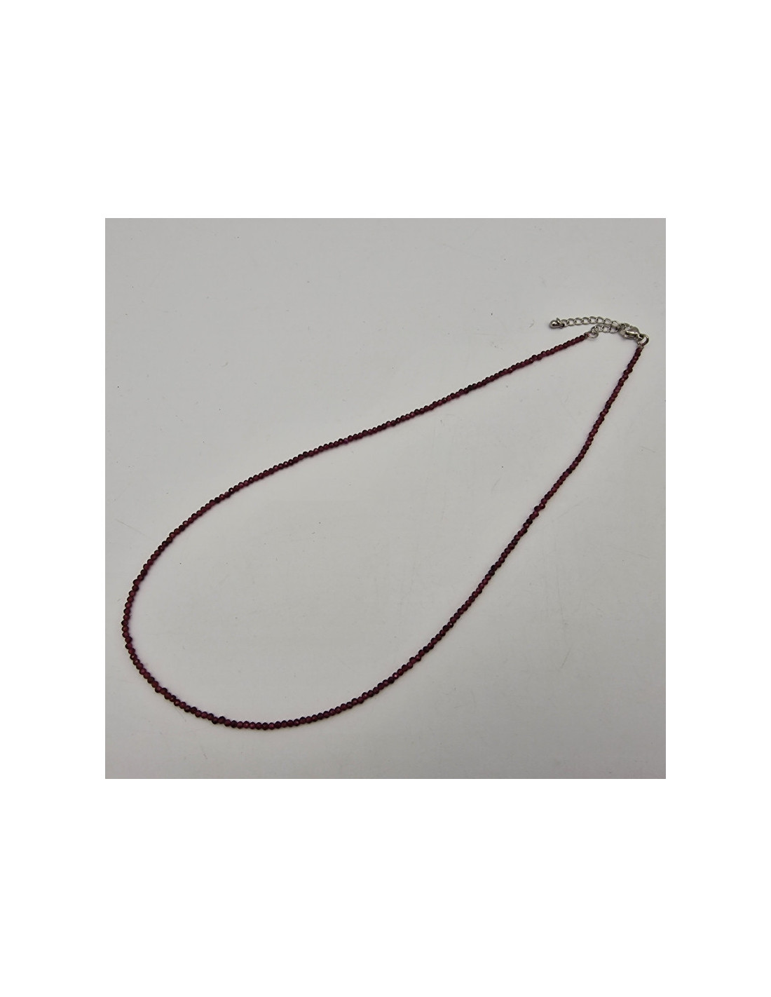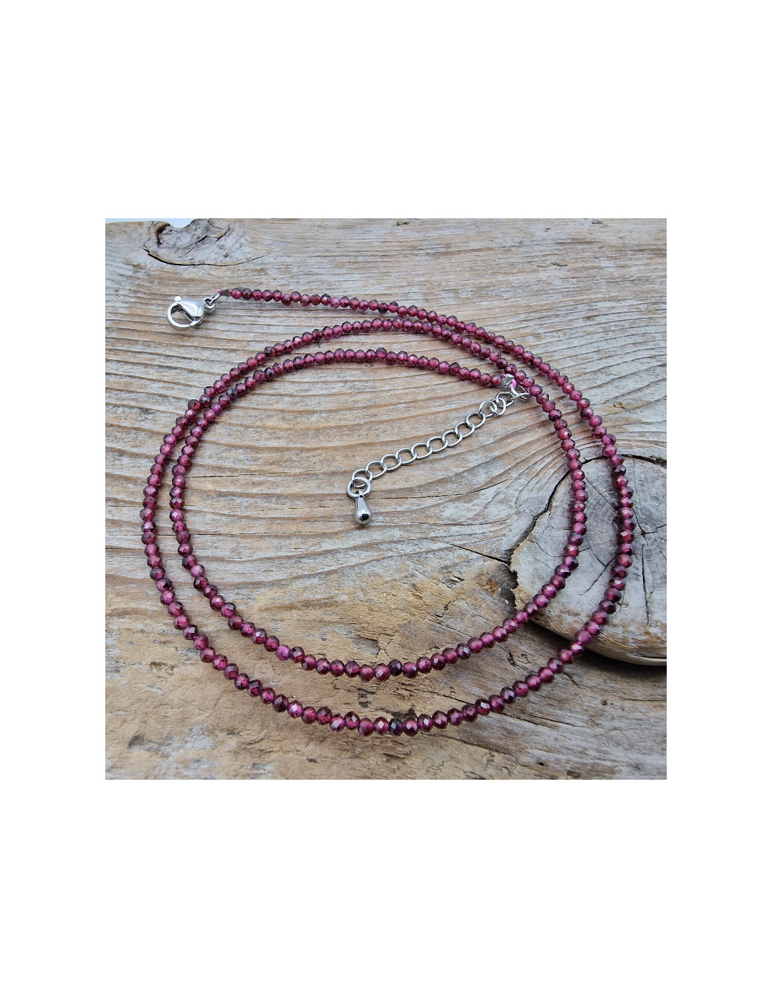 Schöne fertige Granatkette aus facettiert geschliffenen Granaten mit ca.2mm Durchmesser. Die Kette hat einen Messing rhodinierten Karabinerverschluss und ist ca. 53cm lang (inkl. Ketterl). (Durch die Musterfotos kann es zu leichten farblichen Abweichungen kommen. Einschlüsse im Stein sind ein Zeichen der Natur). VPE = 1 Kette