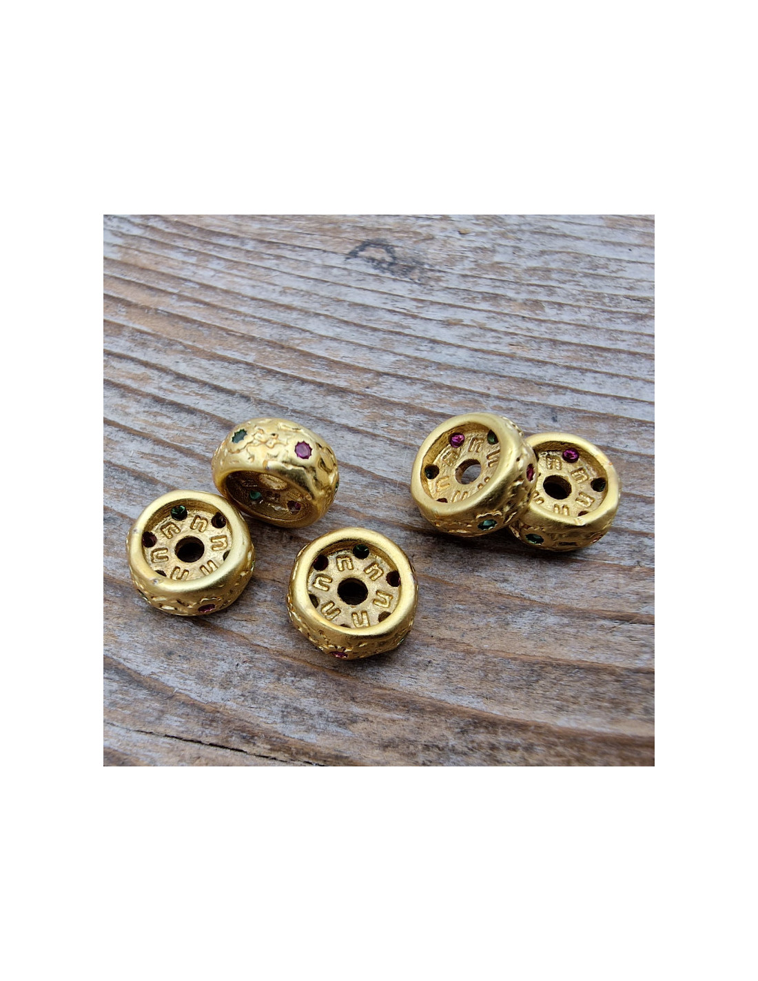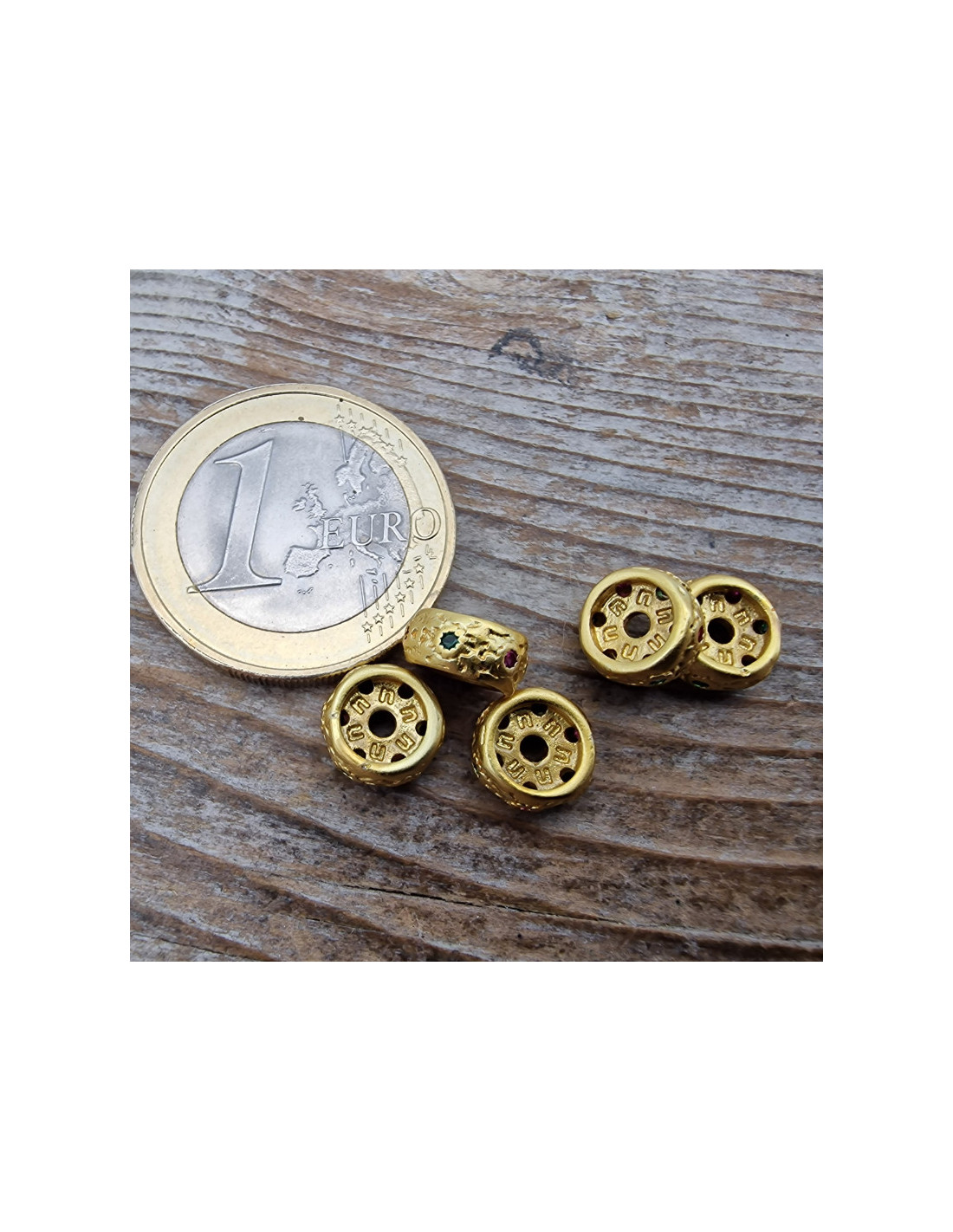 Scheibe mit ca.6mm Durchmesser und ca.1.5mm Dicke aus Metall in Goldfarbe. Bohrung ca.1.5mm Durchmesser. Der Preis ist pro Stück Zwischenteil angegeben.