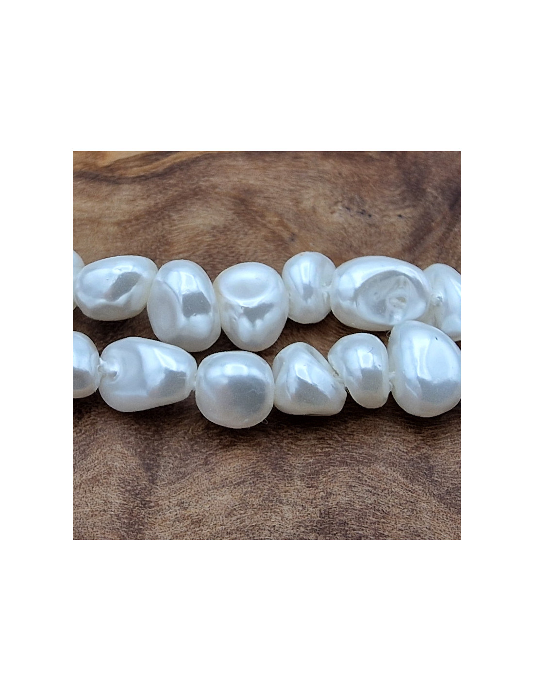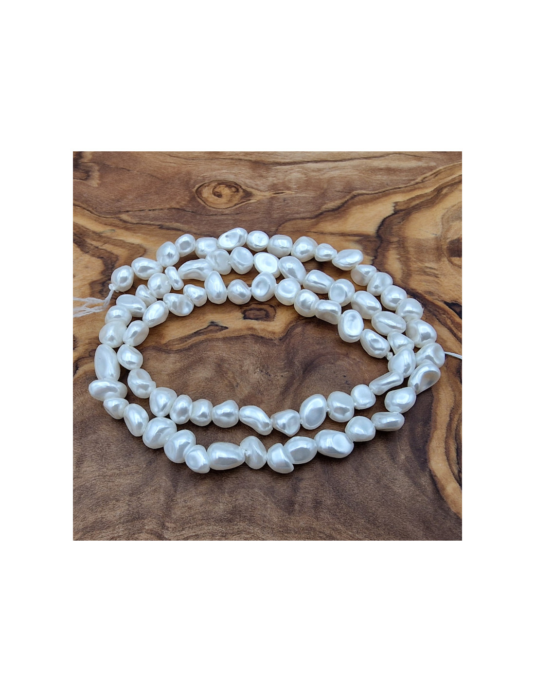 Shellperle in barocker Form. Ganz neuartiges Erscheinungsbild bei diesem sehr schönen weißen Shellperlen Strang. Shellperlen werden auch Muschelkernperlen genannt. Shellperlen oder Muschelkernperlen sind Kunstperlen (keine Zuchtperlen). Sehr schöner Glanz. Die Perlen sind lose am Strang aufgefädelt und die Kette hat noch keine Schliesse. Die Perlen haben einen Durchmesser von ca.6mm. Die Gesamtlänge der Kette (kein Verschluss) beträgt ca.38cm. VPE = 1 Strang