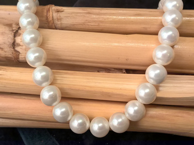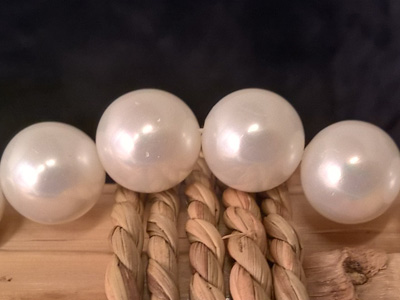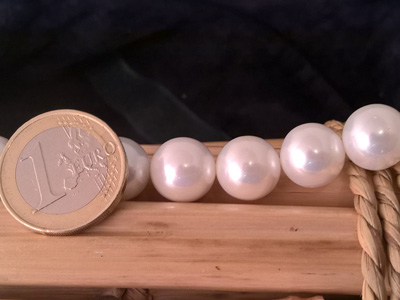 Shell pearls are man-made pearls (no cultured pearls). The beads are strung loosely on the line and the necklace has no clasp. The beads are perfect round with a diameter of about 12mm. The total length of the necklace (no clasp) is about 41cm.