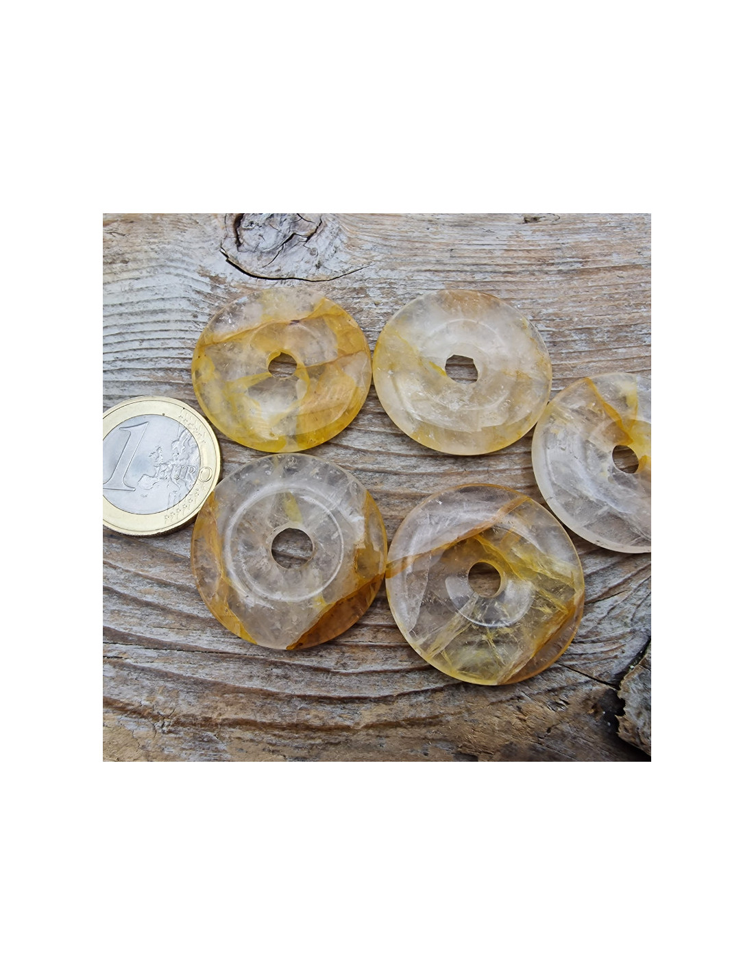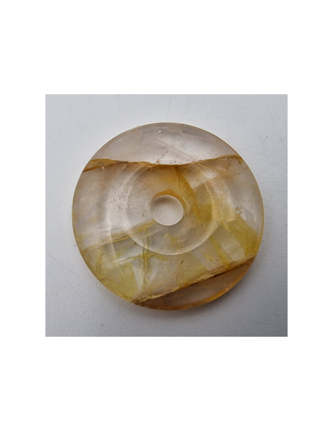 Schöner Donut aus Golden Healer. Golden Healer gehört zu den Silikaten und ist eine Quarz Varietät. Außendurchmesser ca.30mm. Durchmesser Bohrung ca.5mm. Dicke ca.5mm (Der abgebildete Donut ist ein Muster. Durch die Fotos kann es zu leichten farblichen Abweichungen kommen. Einschlüsse sind ein Zeichen der Natur). VPE = 1 Stück
