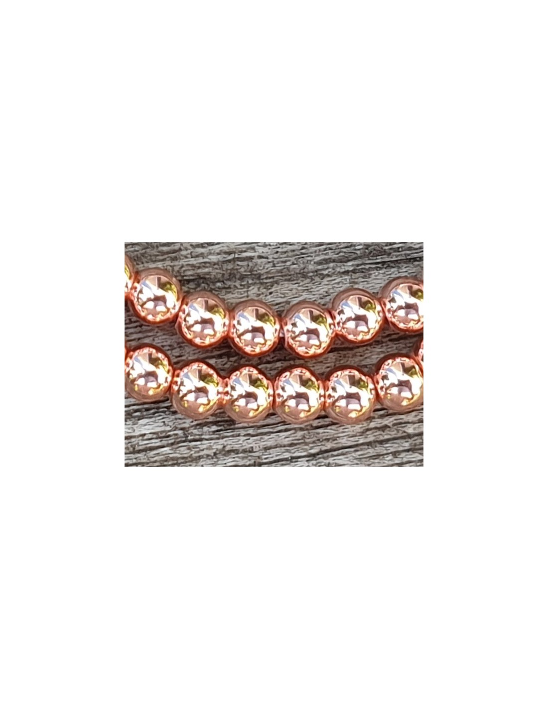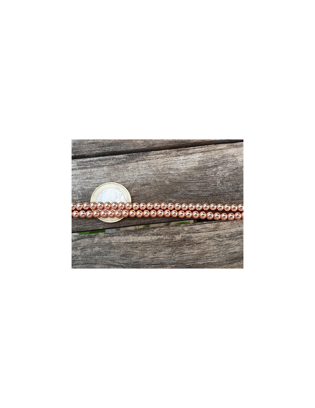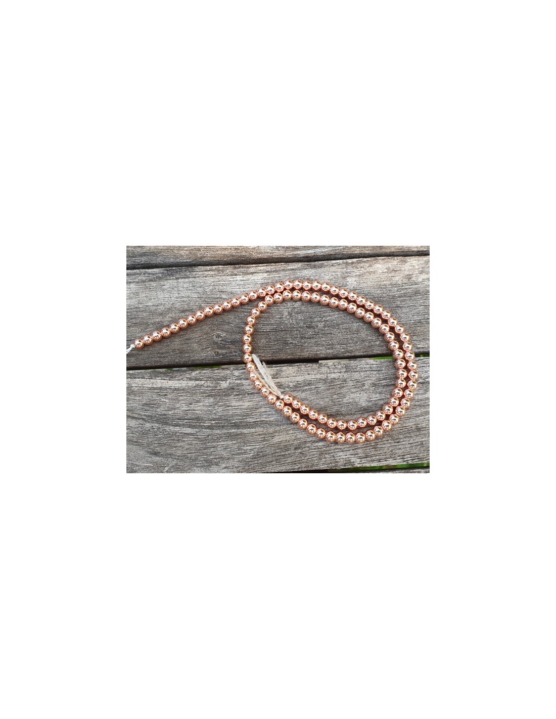 Schöne, rosegoldfarben gefärbte Blutsteinkette (=Hämatit) mit glänzender Oberfläche. Die Perlen haben einen Durchmesser von ca.4mm. Die Steine sind einzeln am Strang aufgefädelt. Die Kette hat noch keinen Verschluss. Der Strang ist ca.40cm lang.  (Die am Musterbild dargestellte artgleiche Kette hat 3mm Durchmesser. Durch die Fotos kann es zu leichten farblichen Abweichungen kommen. Einschlüsse im Stein sind ein Zeichen der Natur).