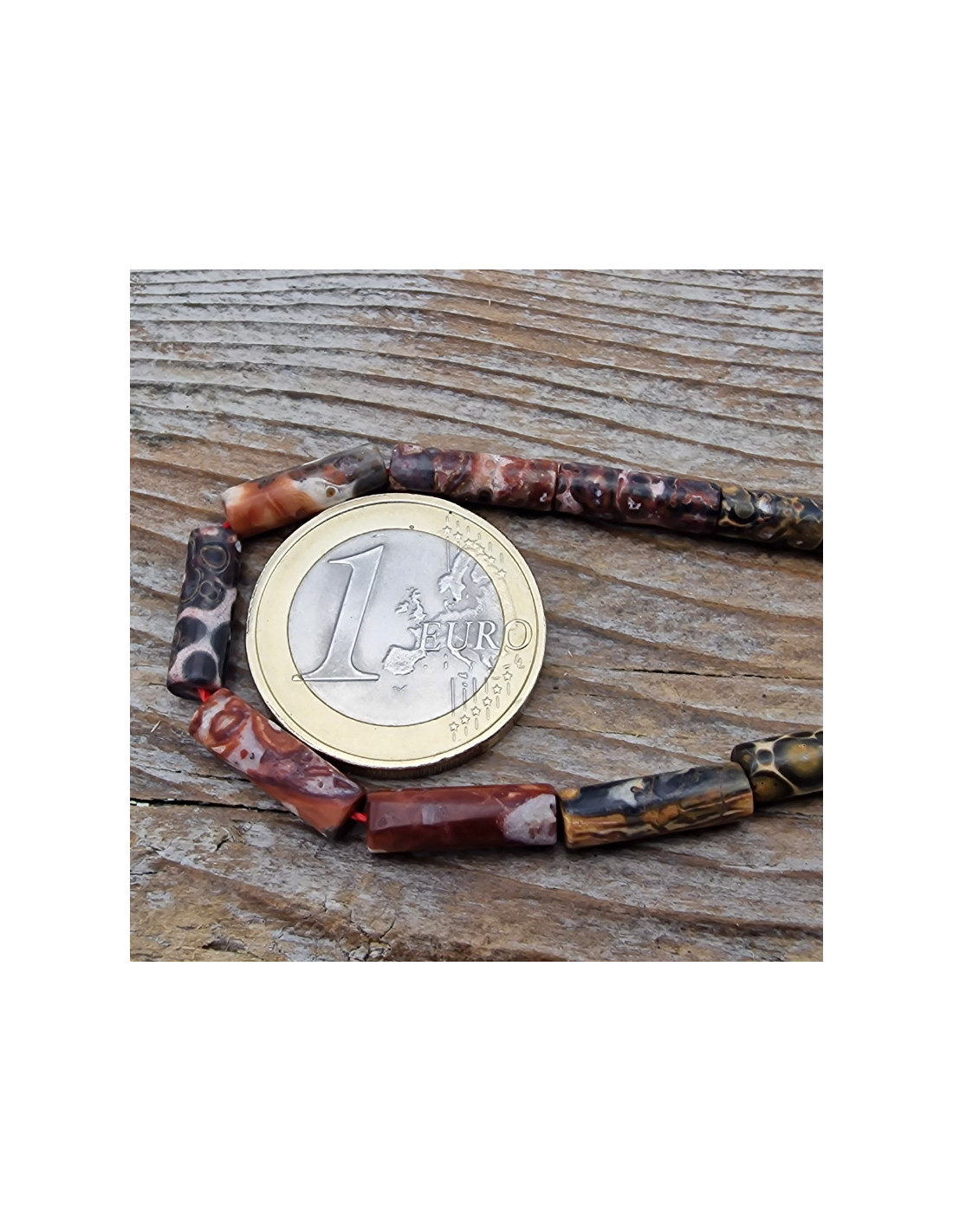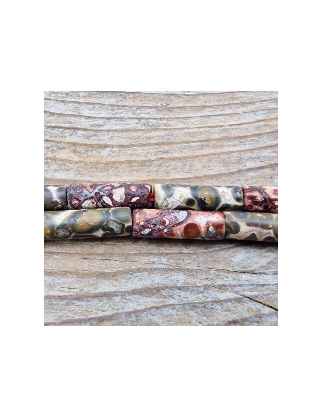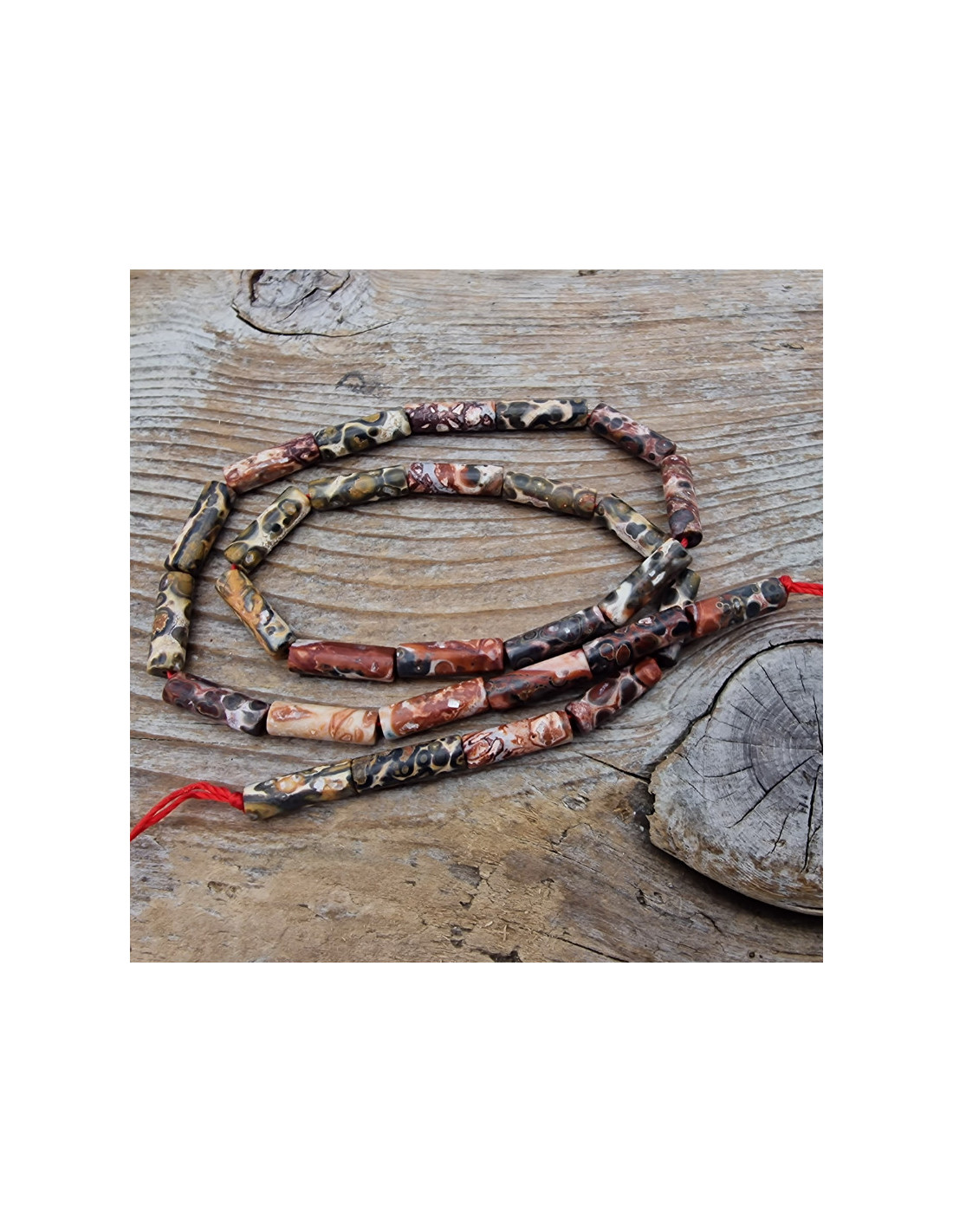 Schöner Leopardenjaspisstrang. Die Steine sind als Zylinder mit ca.4mm Durchmesser, 13mm Länge geschliffen und einzeln am Strang aufgefädelt. Die Kette hat noch keinen Verschluss. Der Strang ist ca.38cm lang. (Durch die Musterfotos kann es zu leichten farblichen Abweichungen kommen. Einschlüsse im Stein sind ein Zeichen der Natur). VPE = 1 Strang