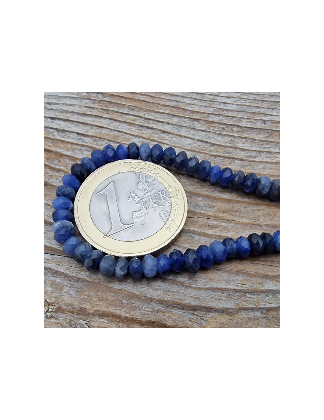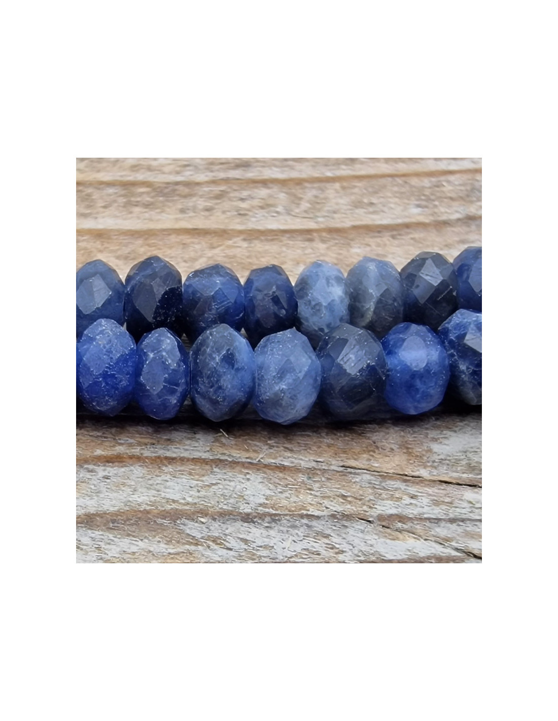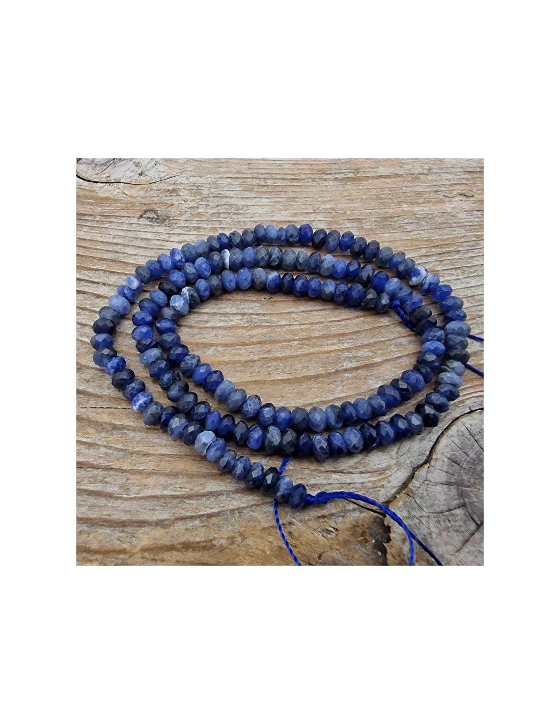 Sehr schöner Sodalithstrang aus facettiert geschliffenen Scheibchen die einzeln am Strang aufgefädelt sind. Die Kette hat noch keinen Verschluss. Der Strang ist ca.38cm lang und die Scheibchen haben einen Durchmesser von ca.4mm. (Durch die Musterfotos kann es zu leichten farblichen Abweichungen kommen. Einschlüsse sind ein Zeichen der Natur). VPE = 1 Strang