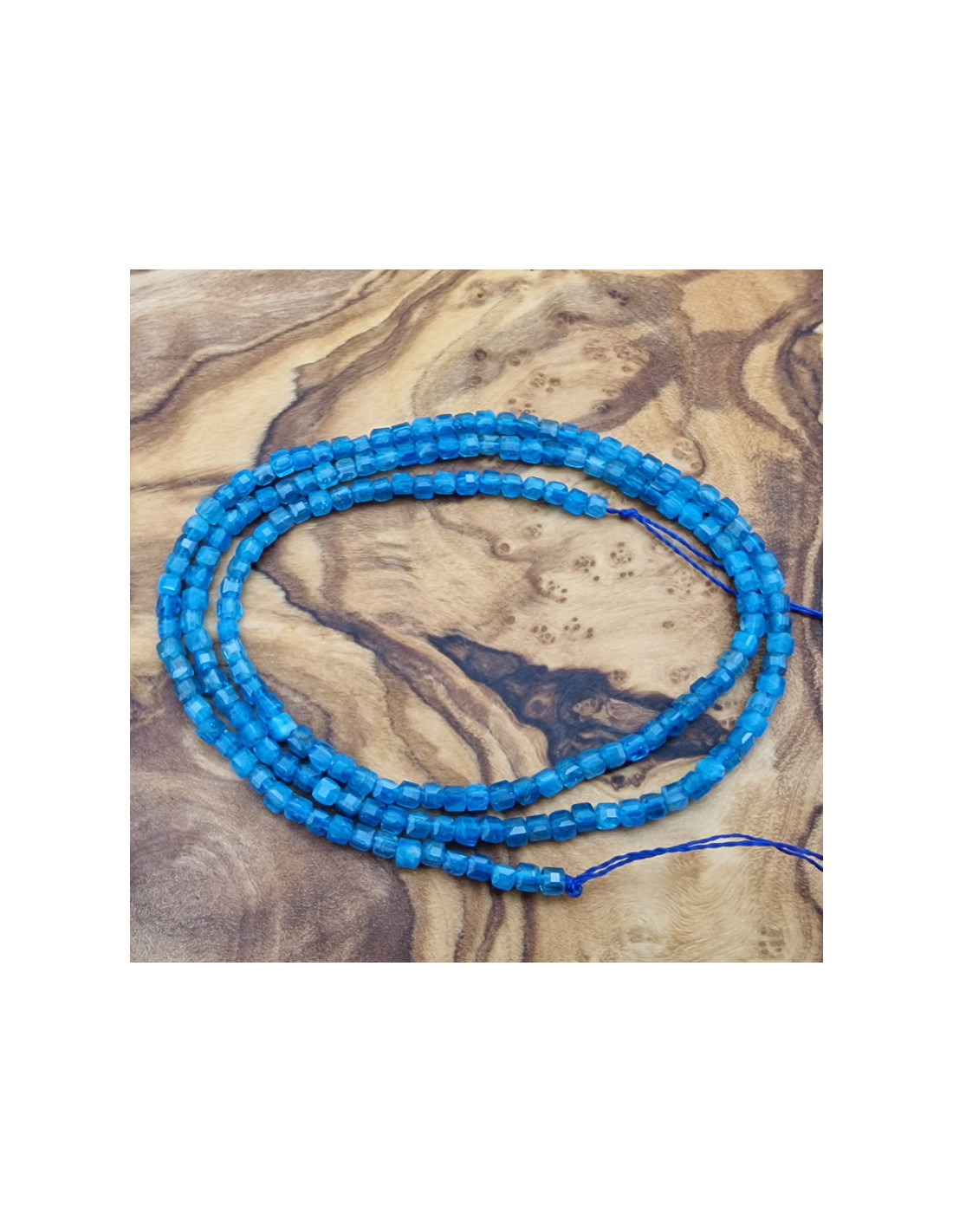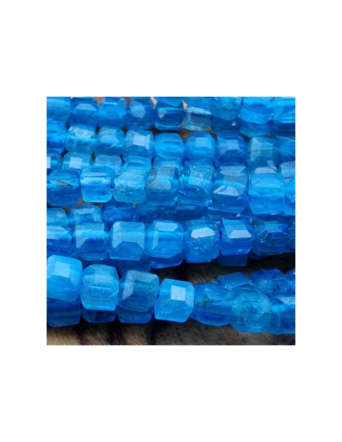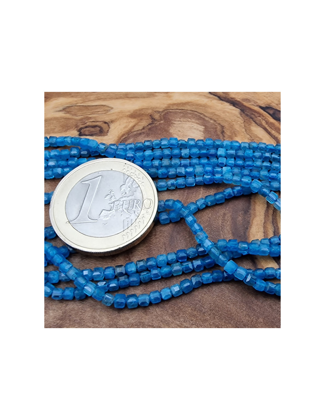 Sehr schöner Apatitstrang. Die Steine sind als Würfel geschliffen und einzeln am Strang aufgefädelt. Die Kette hat noch keinen Verschluss. Der Strang ist ca.38cm lang und die Würfel haben eine Seitenlänge von ca.2mm. (Durch die Musterfotos kann es zu leichten farblichen Abweichungen kommen. Einschlüsse im Stein sind ein Zeichen der Natur). VPE = 1 Strang