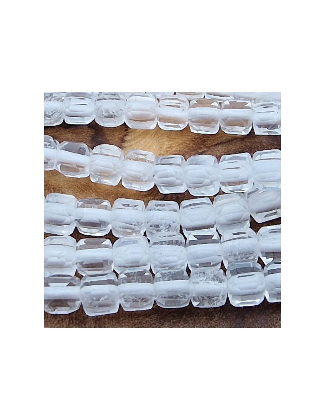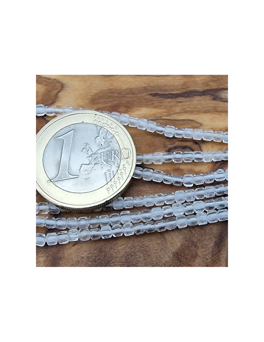 Schöner Bergkristallstrang. Die Steine sind als Würfel mit ca.2mm Seitenlänge geschliffen und einzeln am Strang aufgefädelt. Der Bergkristall ist Naturbergkristall. Die Kette hat noch keinen Verschluss. Der Strang ist ca.38cm lang. (Durch die Musterfotos kann es zu leichten farblichen Abweichungen kommen. Einschlüsse im Stein sind ein Zeichen der Natur). VPE = 1 Strang