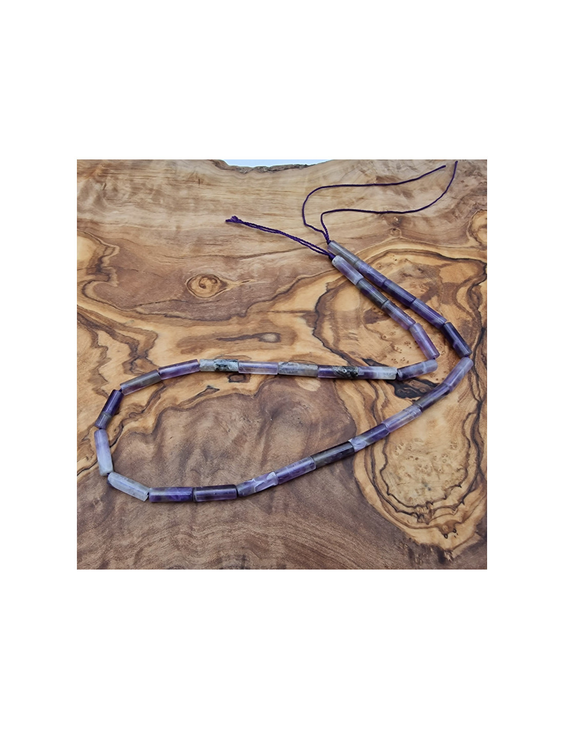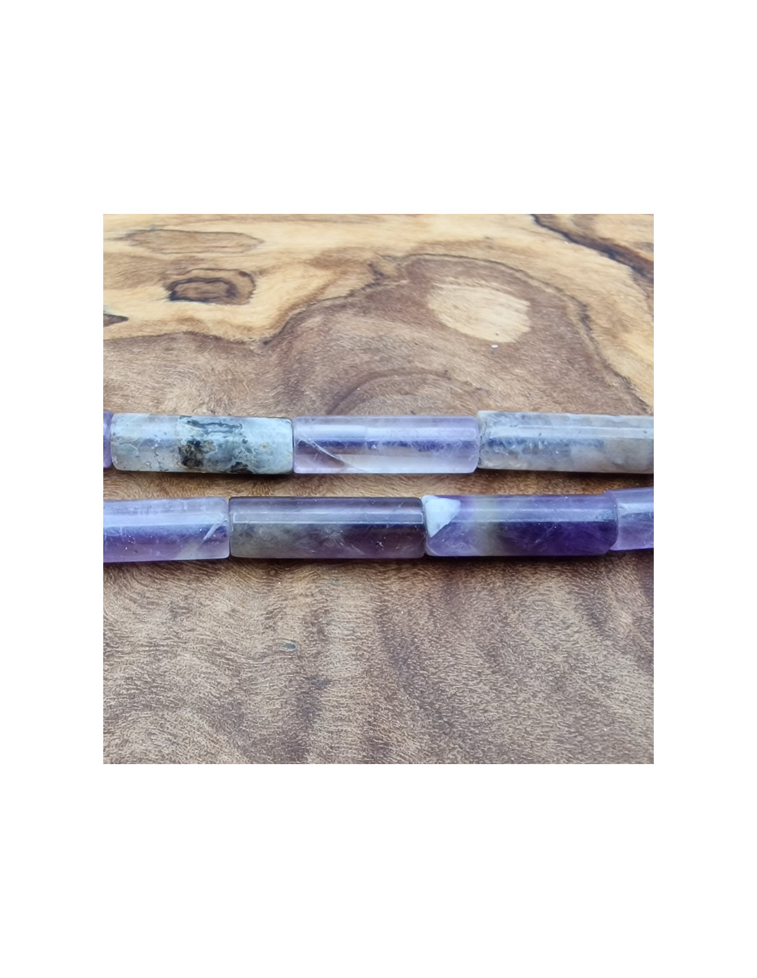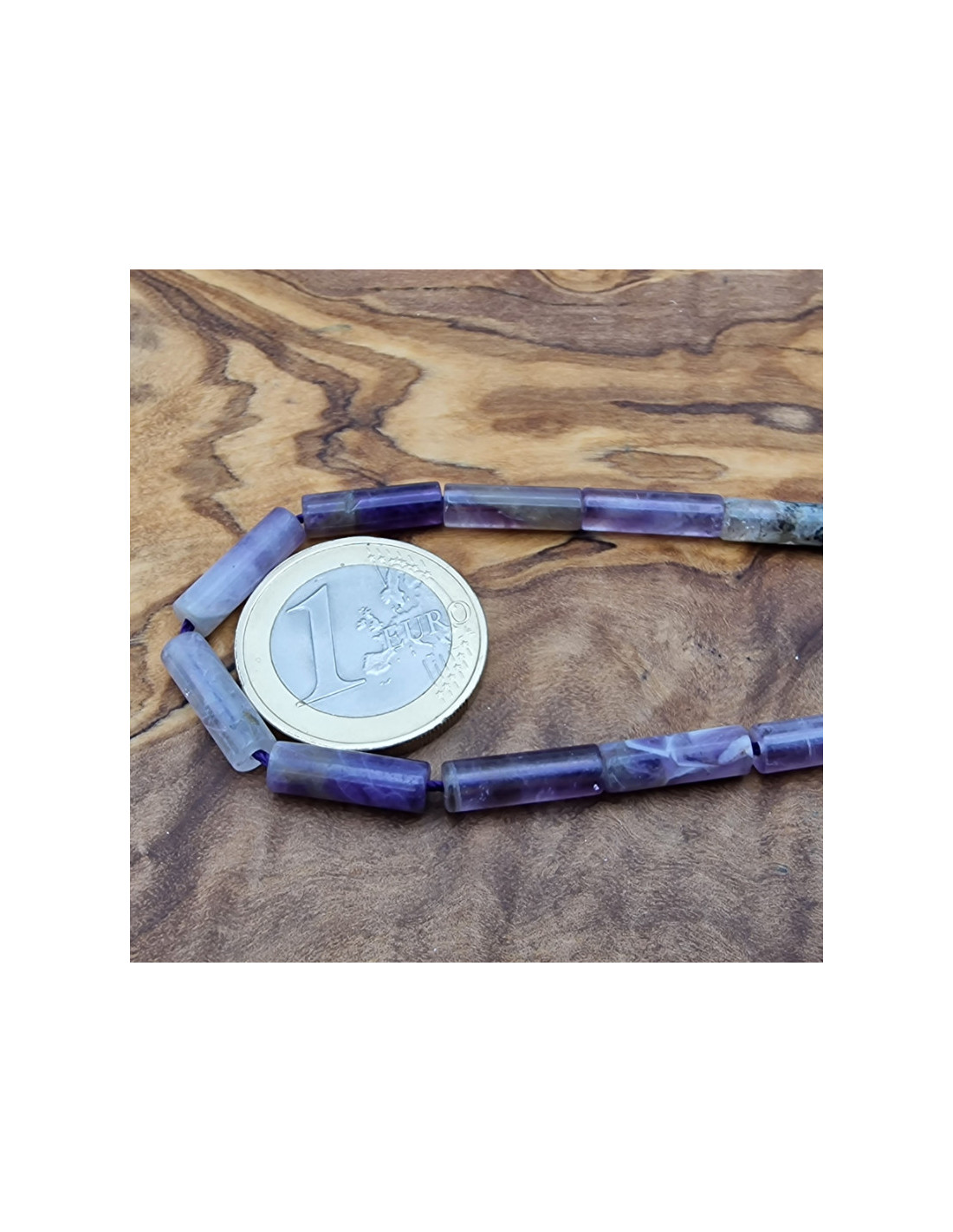 Schöner echter Amethysstrang. Die zylindrischen Perlen haben einen Durchmesser von ca.4mm, eine Länge von ca.13mm und sind einzeln am Strang aufgefädelt. Die Kette hat noch keinen Verschluss. Der Strang ist ca.39cm lang. (Durch die Musterfotos kann es zu leichten farblichen Abweichungen kommen. Einschlüsse im Stein sind ein Zeichen der Natur). VPE = 1 Strang