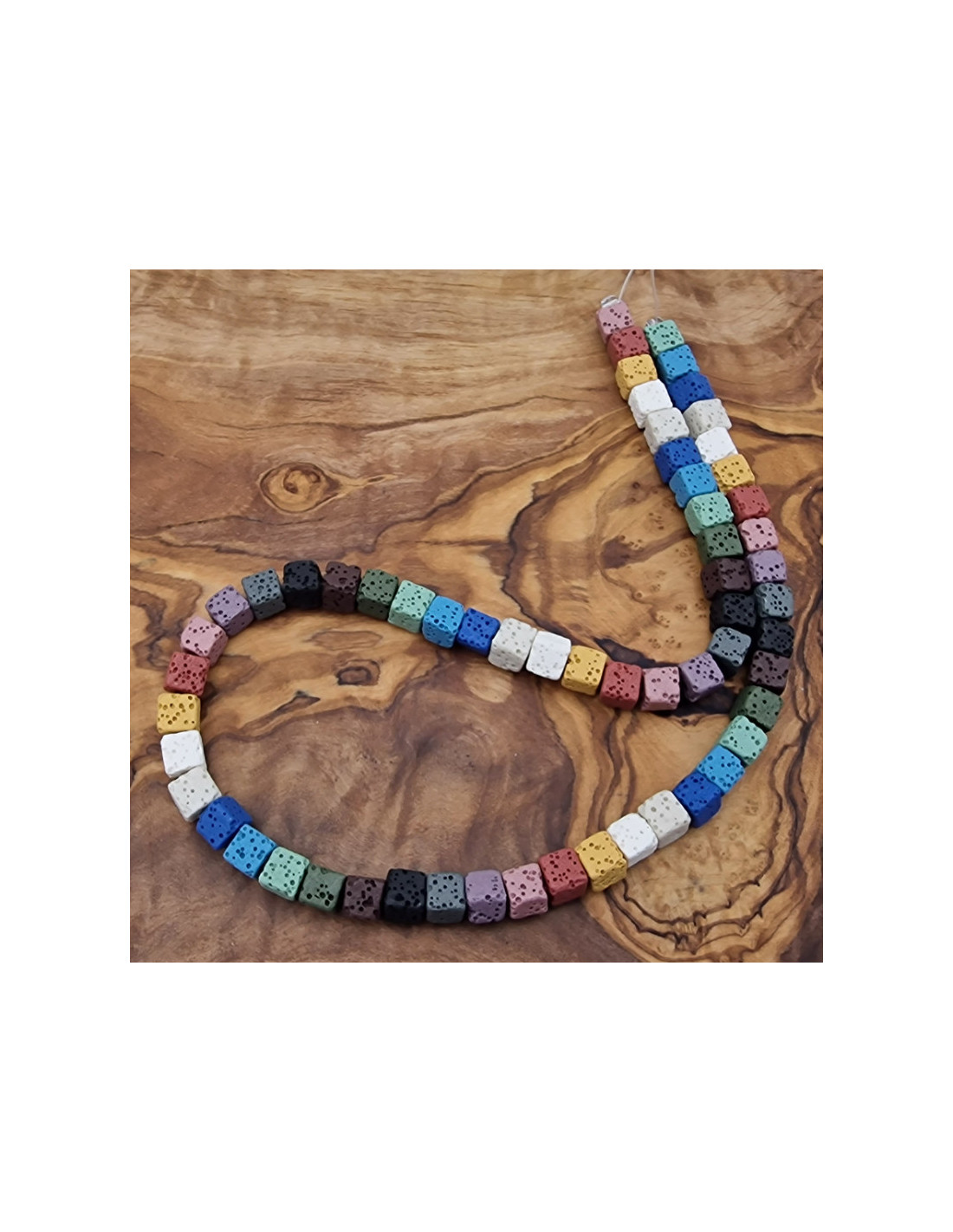 Bunter Lavastrang. Die würfeligen Perlen haben eine Seitenlänge von ca.6mm und sind einzeln am Strang aufgefädelt. Der Strang hat noch keinen Verschluss. Der Strang ist ca.38cm lang. (Durch die Musterfotos kann es zu leichten farblichen Abweichungen kommen. Einschlüsse im Stein sind ein Zeichen der Natur). VPE = 1 Strang