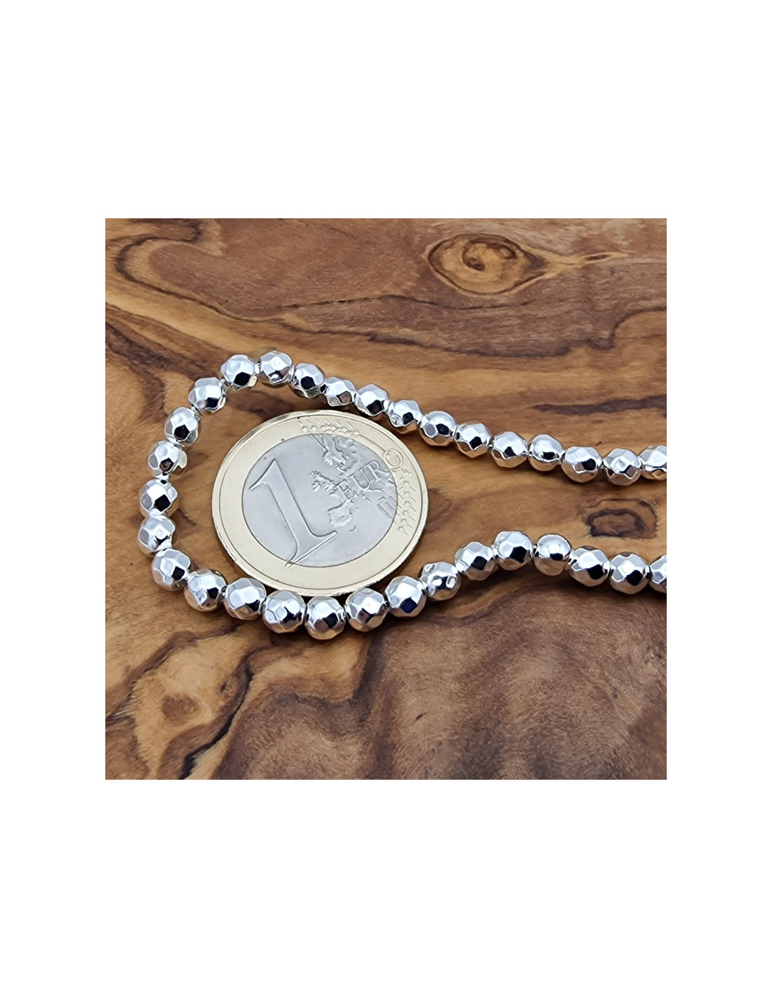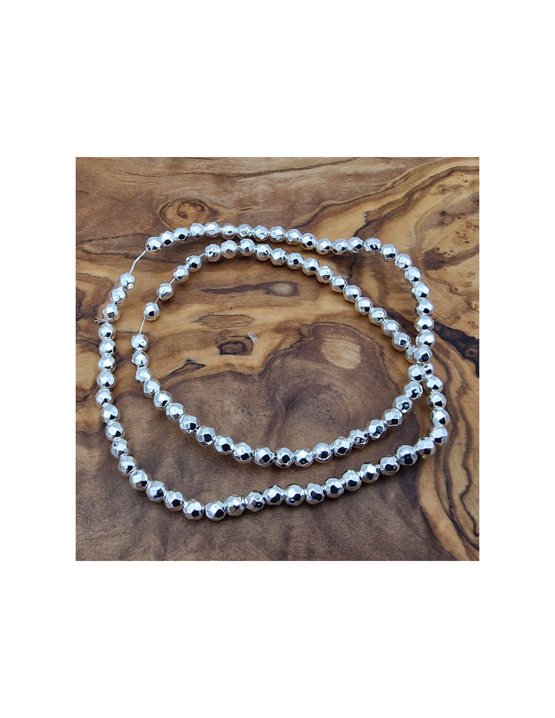 Schöne, silberfarben gefärbte Blutsteinkette (=Hämatit) mit glänzender Oberfläche. Die Perlen haben einen Durchmesser von ca.4mm. Die Steine sind einzeln am Strang aufgefädelt. Die Kette hat noch keinen Verschluss. Der Strang ist ca.39cm lang. (Durch die Musterfotos kann es zu leichten farblichen Abweichungen kommen. Einschlüsse im Stein sind ein Zeichen der Natur). VPE = 1 Strang